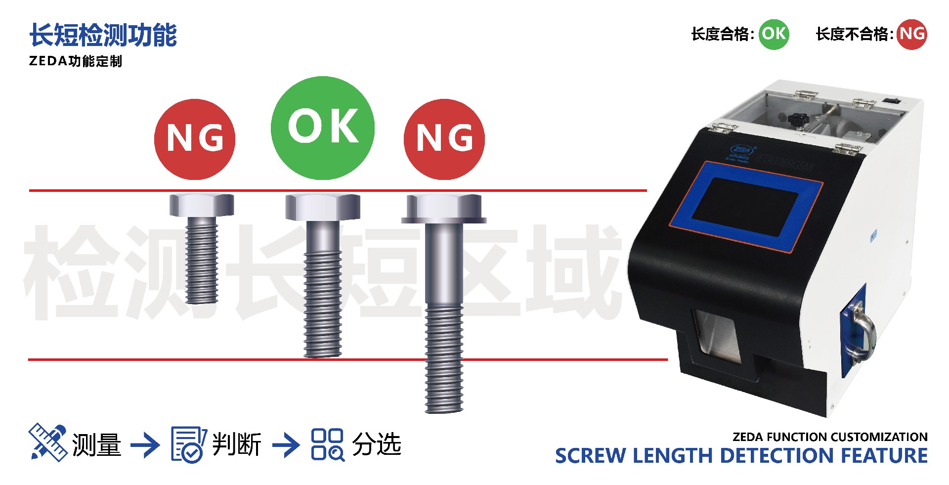 影響最終鎖附品質的關鍵變量。為此,集成于供料環(huán)節(jié)的長短檢測(Length Detection)功能——在行業(yè)中亦稱為尺寸篩選(Size Screening)或良品篩選(OK/NG Sorting)——已成為保障良率不可或缺的“智能守門員”,尤其針對危害最大的短料檢測(Short Screw Detection)需求。
